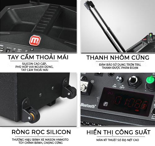 Thời gian sử dụng của loa tương đối lớn, có thể kéo dài từ 4 – 6 tiếng và có thể kết nối với bình acquy 12V nếu như đang dùng mà hết bình đột ngột. Đi kèm với loa còn có một micro không dây có độ tương thích khá cao với loa.